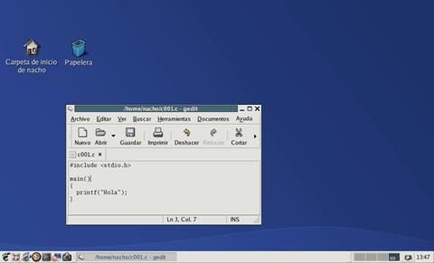 Los sistemas operativos de la familia Unix, como Linux, suelen incluir un compilador de C, de modo que será fácil probar nuestros programas. Supondremos que se trata de una versión de Linux de los últimos años, que tenga entorno gráfico. Podríamos usar el editor del texto del entorno gráfico, teclear el fuente y guardarlo en nuestra carpeta personal, por ejemplo con el nombre ejemplo001.c (lo que sí es importante es que termine en “.c”):